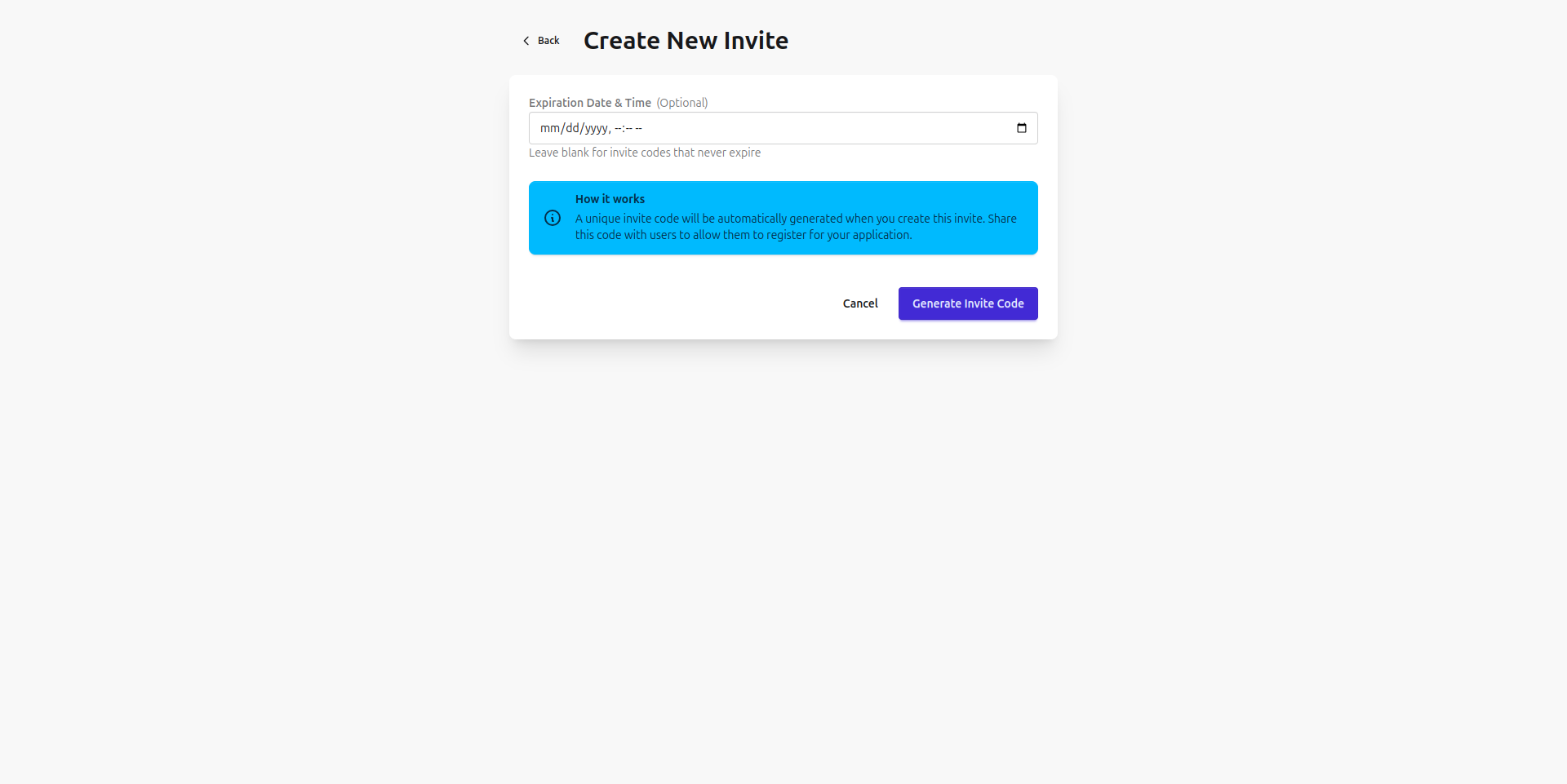 The invite creation form focuses on simplicity, allowing administrators to set an optional expiration date. An informational note explains that codes are automatically generated.