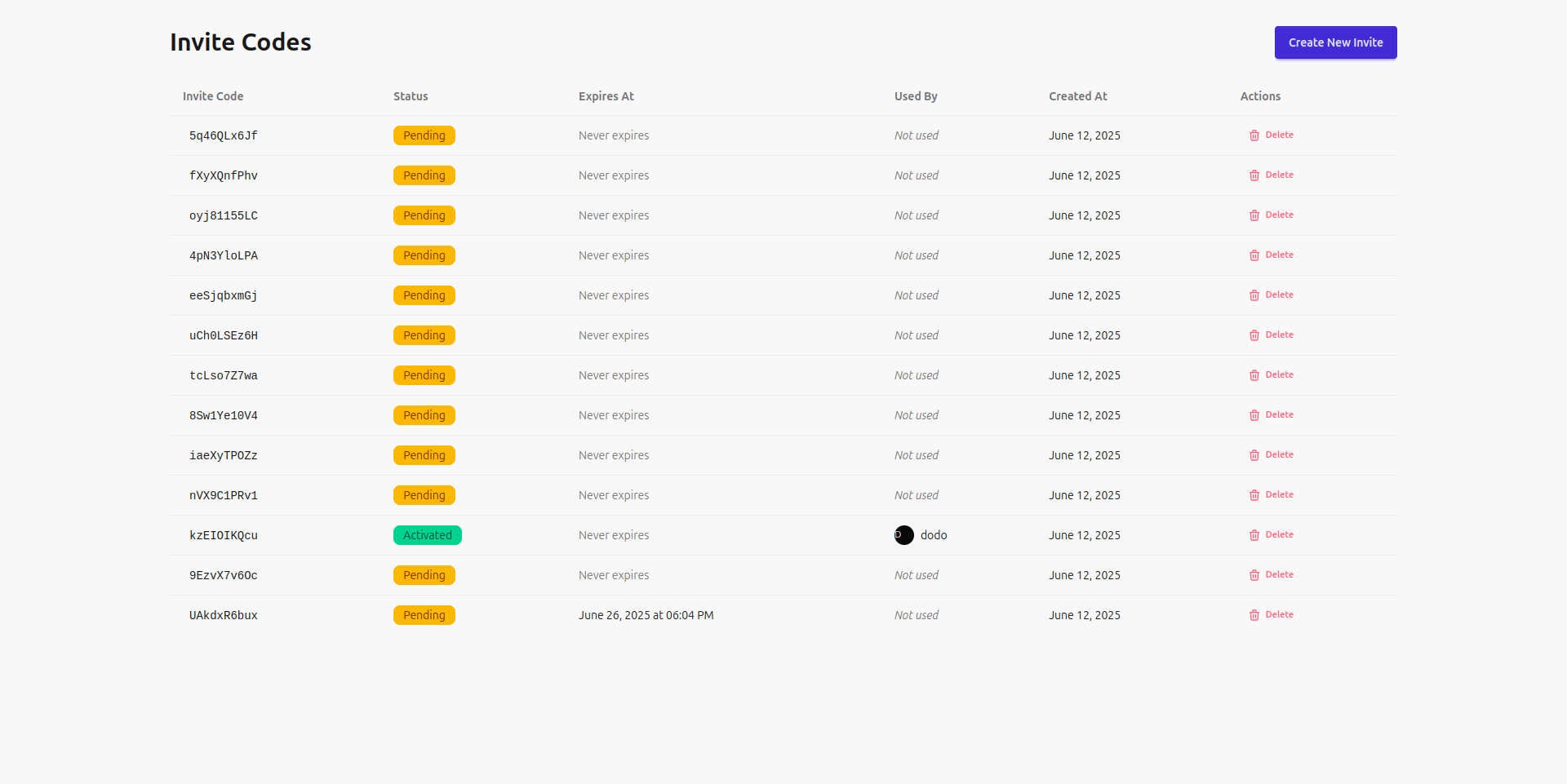 For administrators, the invite management page presents a clear overview of all generated codes, showing their status, expiry, and redemption details. There’s an easy way to create new invites and delete unused ones.
