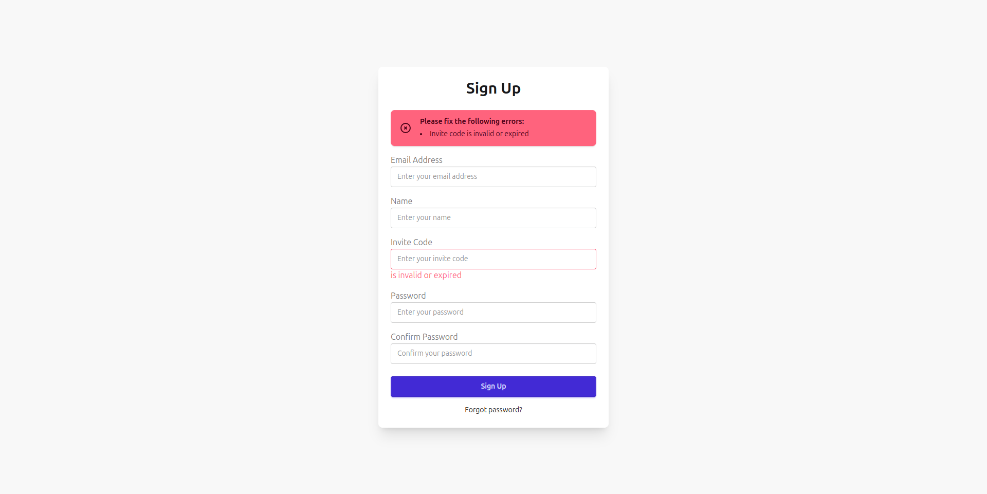 On the user registration side, the sign-up form now includes a dedicated “Invite Code” field. Validation errors are clearly displayed both generally and for specific fields, guiding users to correct any issues, including an invalid or expired invite code.
